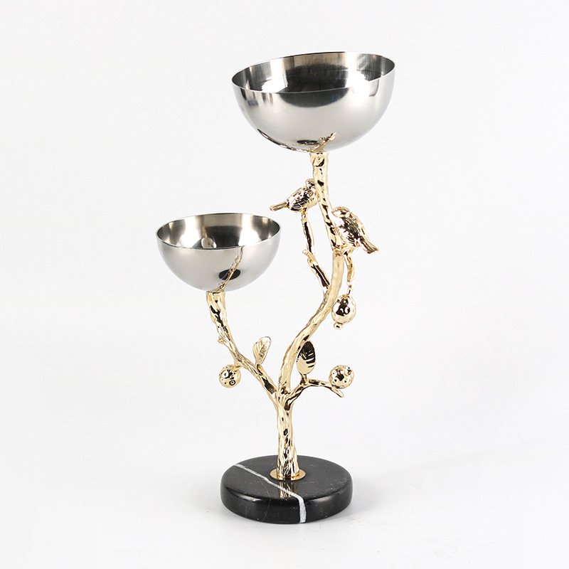 Designer Artistic Branch Bird Double-Tiered Metal Snack Bowl Fruit Dish